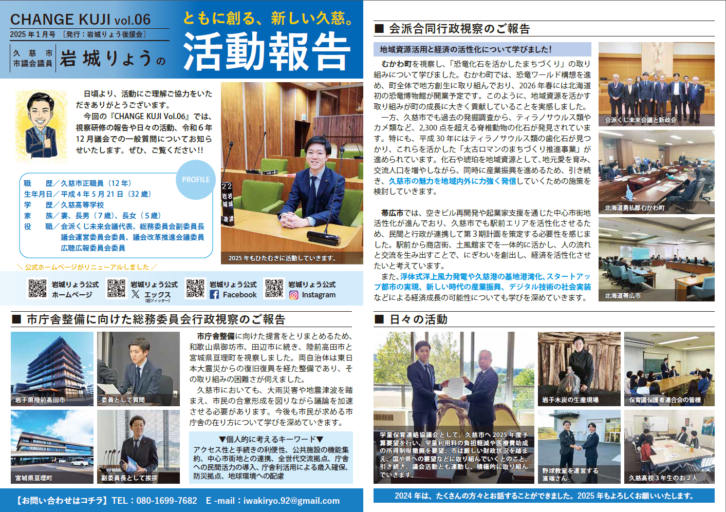 今回の『CHANGE KUJI Vol.06』では、視察研修の報告や日々の活動、令和6年12 月議会での一般質問についてお知らせいたします。ぜひ、ご覧ください‼